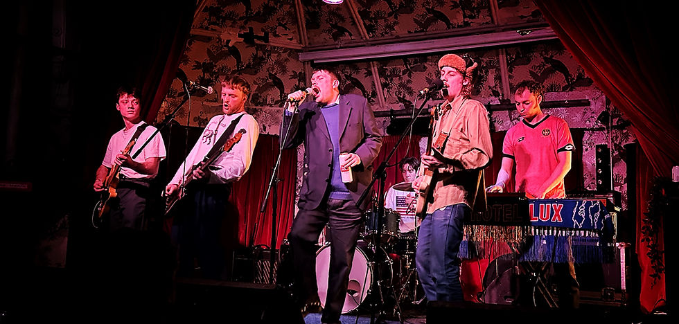 To the headliners. I first stumbled across Hotel Lux 4 years ago, which seems impossible, but time still doesn’t make much sense to me after the last few years. Back then they were supporting Dilly Dally (must see if they’re still about), looked a bit disheveled, but sounded great. They’ve now got an album out and the new tunes sound even better. I’d compared them to The Fall and Art Brut last time, they’re definitely moving much more to the latter with a bigger pop feel, that’s more bouncy and fun. Don’t worry though, that dry delivery is still there. Songs about how much people earn, or don’t. Football players getting younger and absent fathers. Lewis still likes to sing with a can in hand, but he’s made an effort tonight with a natty suit and jumper combo. They feel much more menacing live. There’s nothing to reign them in. Vocals are snarled and violins shredded. ‘Easy Being Lazy’ slows things down though and I’ll admit, it’s not my favourite, but I’m all in favour of mixing thing up. ‘The Ballad of You and I’ brings the stomp back… and then the acoustic comes out. I do like this band and urge any reader to have a listen, but live it’s a bit up and down. Maybe I’m just not in the mood to be sad and whimsical, or maybe there’s two bands up there trapped together. I’m not sure, but they’ve definitely moved on, maybe I just need to catch up. ‘Tabloid Newspaper’, ‘Common Sense’, ‘National Team’, these are the songs I’m here for. ‘Eastbound and Down’ closes with all the angular guitars, hooky bass, solid drums and keyboard swagger that I’ve come to love from Hotel Lux. I’m not going to pretend it’s my favourite set, but this band are more than meets the eye, they’re a twisty bunch and whoever put this line up together needs a pat on the back. Off to the merch table. Support small venues. Support new bands… and even ones that have been round a few years.
